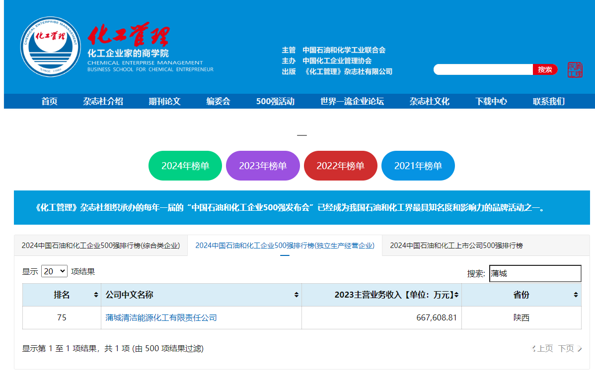 近日,中国化工企业管理协会发布2024中国石油和化工企业500强榜单,蒲洁能化公司位列独立生产经营类企业第75位,这是蒲洁能化公司自2017年起连续第8年荣登该榜单。