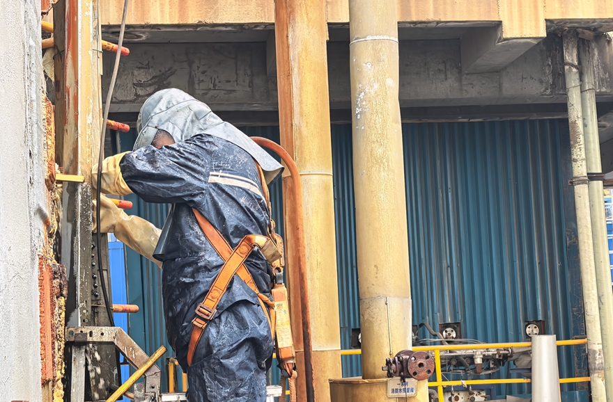 “时间不等人,我熟悉现场情况,我先上!”殷宇龙迅速穿戴好防护服、防护面罩,手持堵漏工具,弓着身子一步步靠近泄漏部位。浆液不断打在他的防护装备上,发出“嗒嗒”声响,他却丝毫未受影响,双眼紧盯着漏点,双手稳稳地清理破损处、填塞堵漏材料、加固密封层。每一个动作都精准利落,每一个步骤都争分夺秒,他心里只有一个念头:“尽快堵住漏点,不能影响生产。”